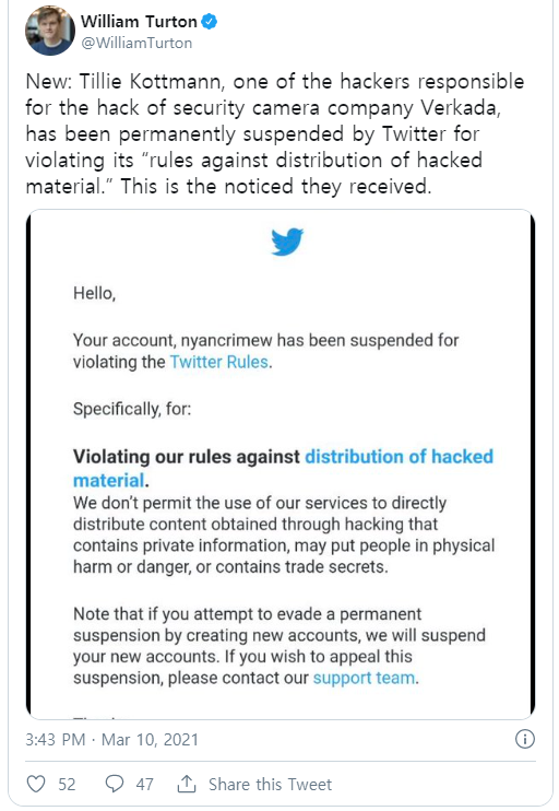 이 해커 그룹의 멤버 중 한명인 Tillie Kottmann은 기업 보안 카메라 운영 회사인 Verkada의 슈퍼 어드민 계정을 사용하여 이 감시 카메라에 접근이 가능했다고 밝혔습니다.