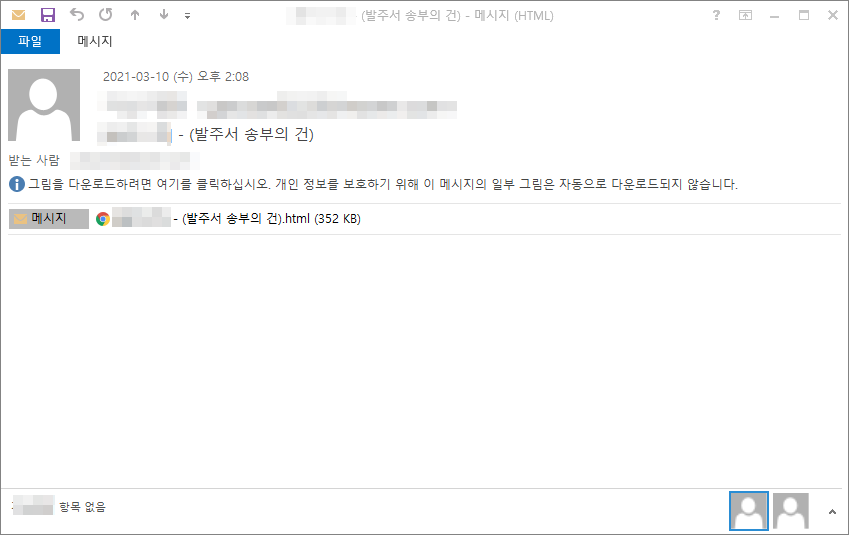 이번에 발견된 메일은 “[플***] - (발주서 송부의 건)”라는 제목으로 수신되었으며, 특정 업체명을 도용해 실제 기업에서 발송한 것처럼 위장했습니다.