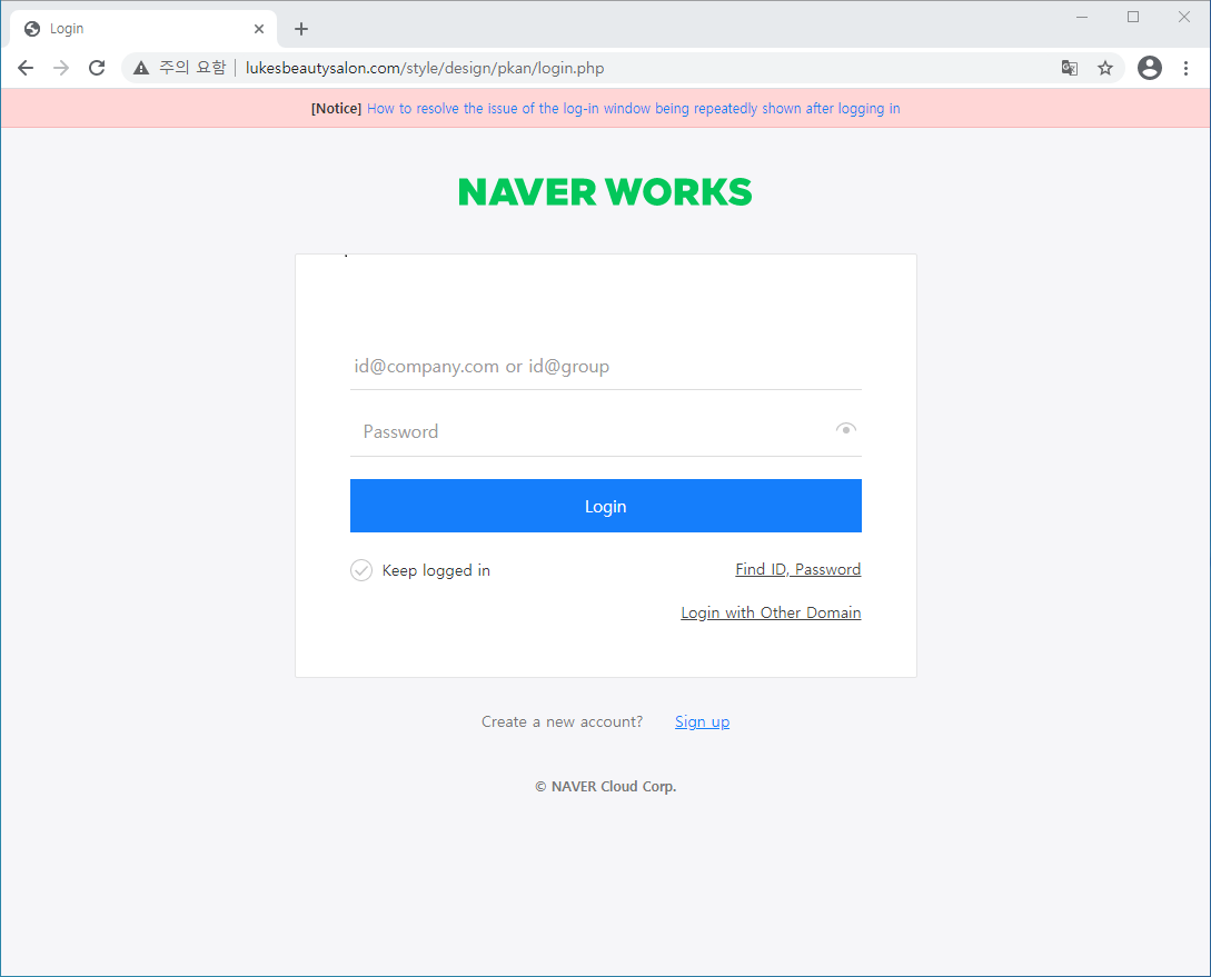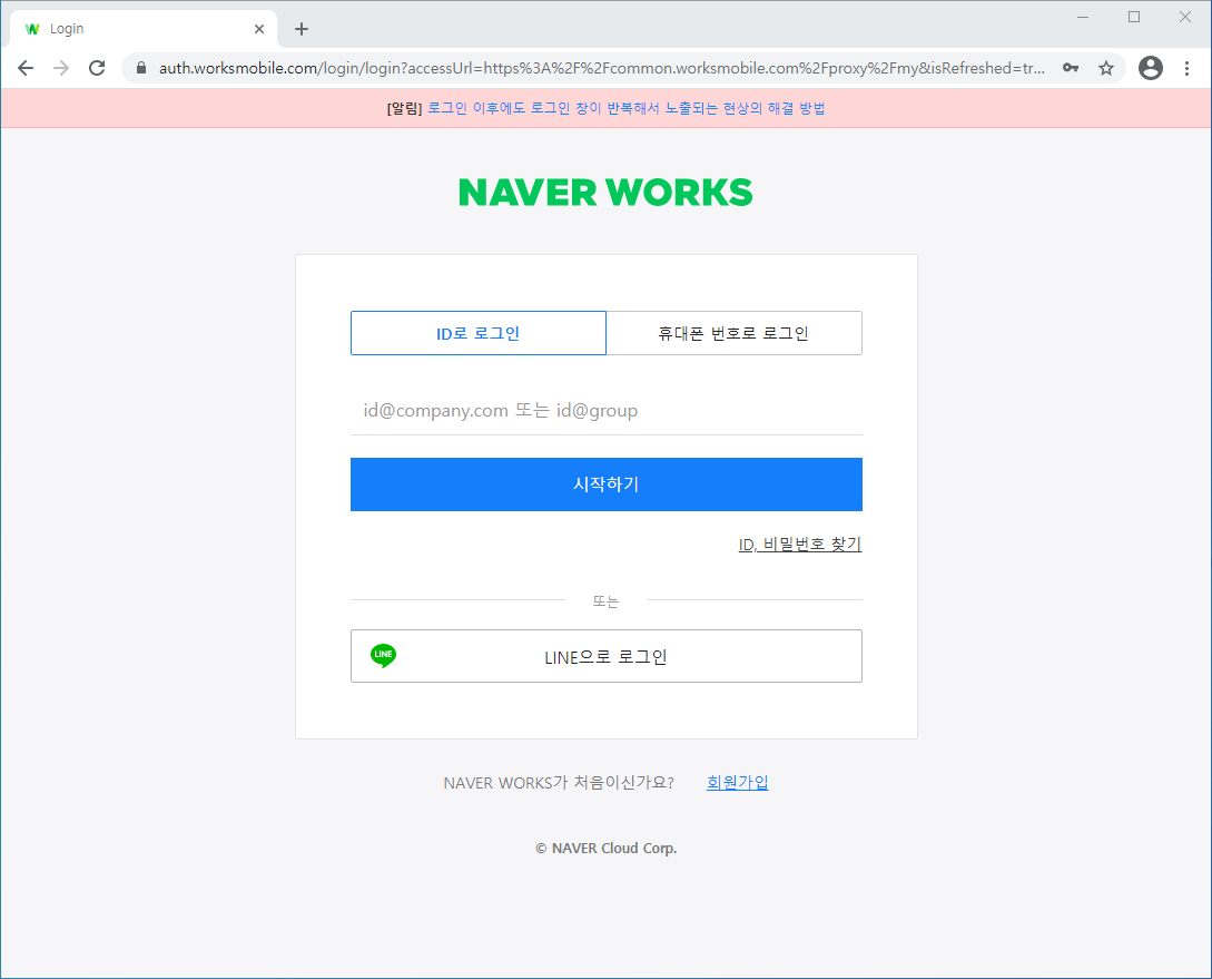개인정보가 전달된 후에는 실제 "NAVER WORKS 로그인" 페이지로 리디렉션됩니다.