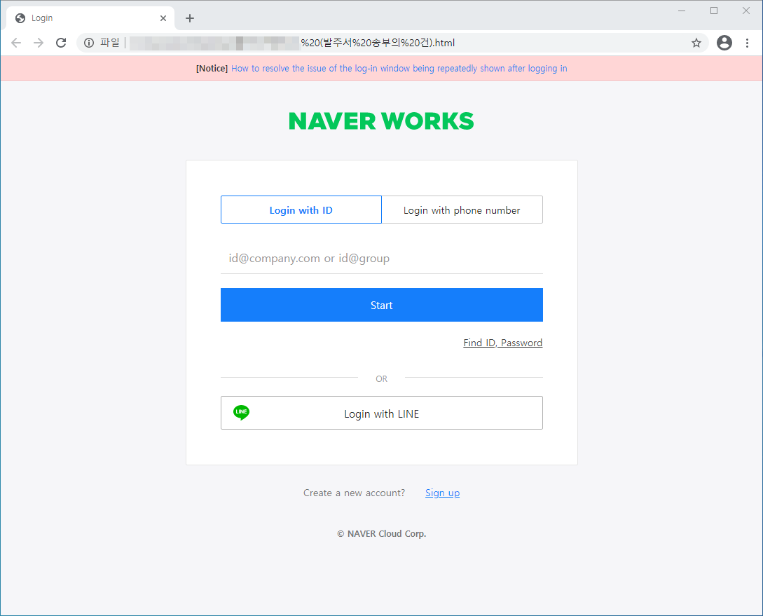 사용자가 발주서 내용 확인을 위해 첨부된 파일을 다운로드하여 실행할 경우, 브라우저를 통해 “NAVER WORKS” 계정과 패스워드를 가로채기 위한 피싱 페이지로 연결됩니다.