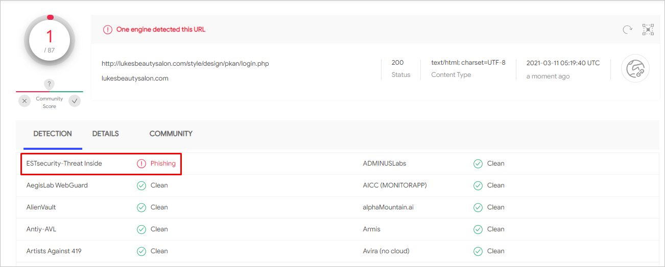 현재 이스트시큐리티 ‘쓰렛 인사이드(Threat Inside)’에서는 해당 피싱 사이트를 아래와 같이 탐지하고 있습니다.