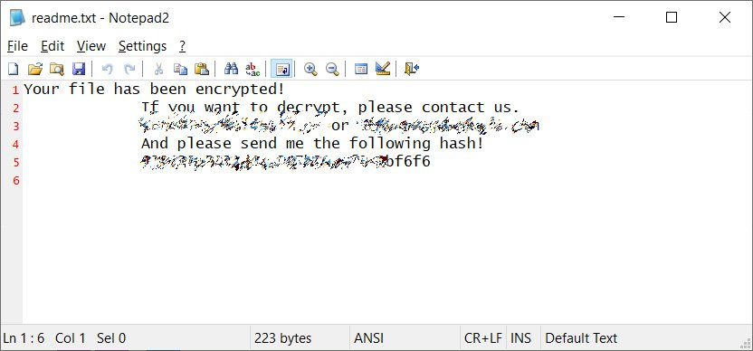 이 랜섬노트는 공격자의 이메일 주소 2개와 고유 해시를 포함하고 있습니다. 연구원은 이 해시가 RSA 공개키의 MD4 해시라 밝혔습니다.