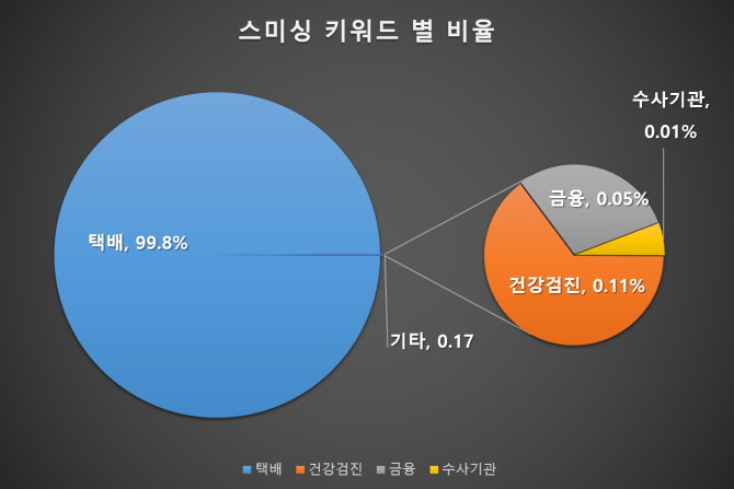 이어서 건강 검진 관련 스미싱 문자가 0.11%를 차지하고 있으며 나머지 스미싱 문자의 발견 비율은 0.06% 정도입니다.