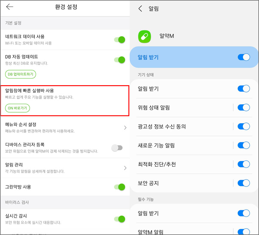 OS 8.0 이상 버전에서는 알약M의 환경설정 -> 알림창에 빠른 실행바 사용 -> 알림 받기 ON 설정을 통해 빠른 실행바를 사용할 수 있습니다. 빠른 실행바 사용만 ON으로 바꿔주면 이름처럼 빠르게! 알약M 기능들을 이용할 수 있는데요.