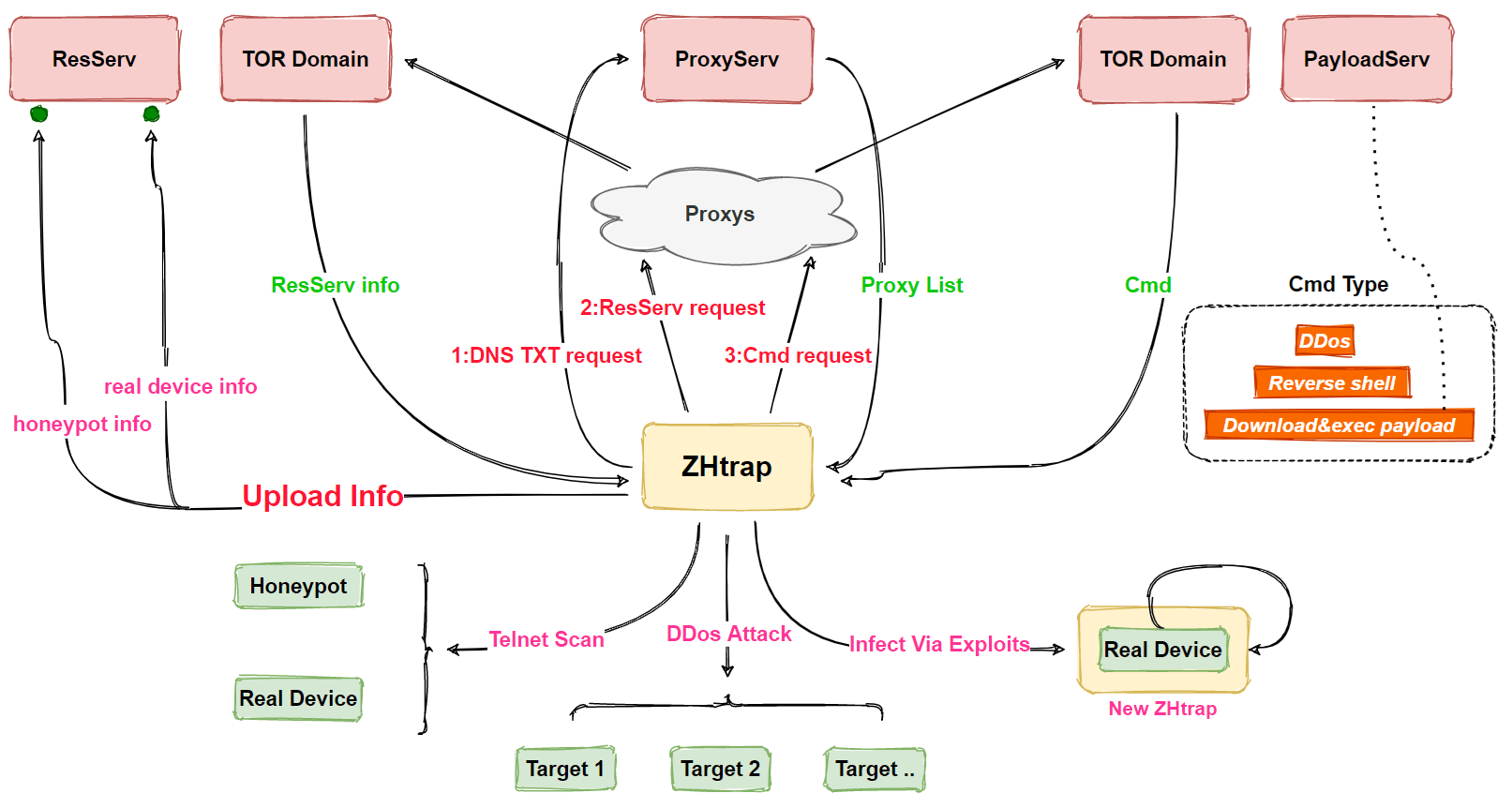 ZHtrap은 x86, ARM, MIPS를 포함한 여러 아키텍처를 지원합니다. ZHtrap 봇넷은 Mirai와는 여러 차이점을 보입니다. 예를 들면 ZHTrap은 명령을 위해 체크섬 메커니즘을 사용합니다. 스캐닝 전파 과정에서는 실제 기기와 허니팟을 구분하는 기능을 추가했으며, XOR 암호화 알고리즘을 재설계하고, 해킹된 기기를 단순한 허니팟으로 변환하고 프로세스 제어 메커니즘 세트를 구현했습니다.