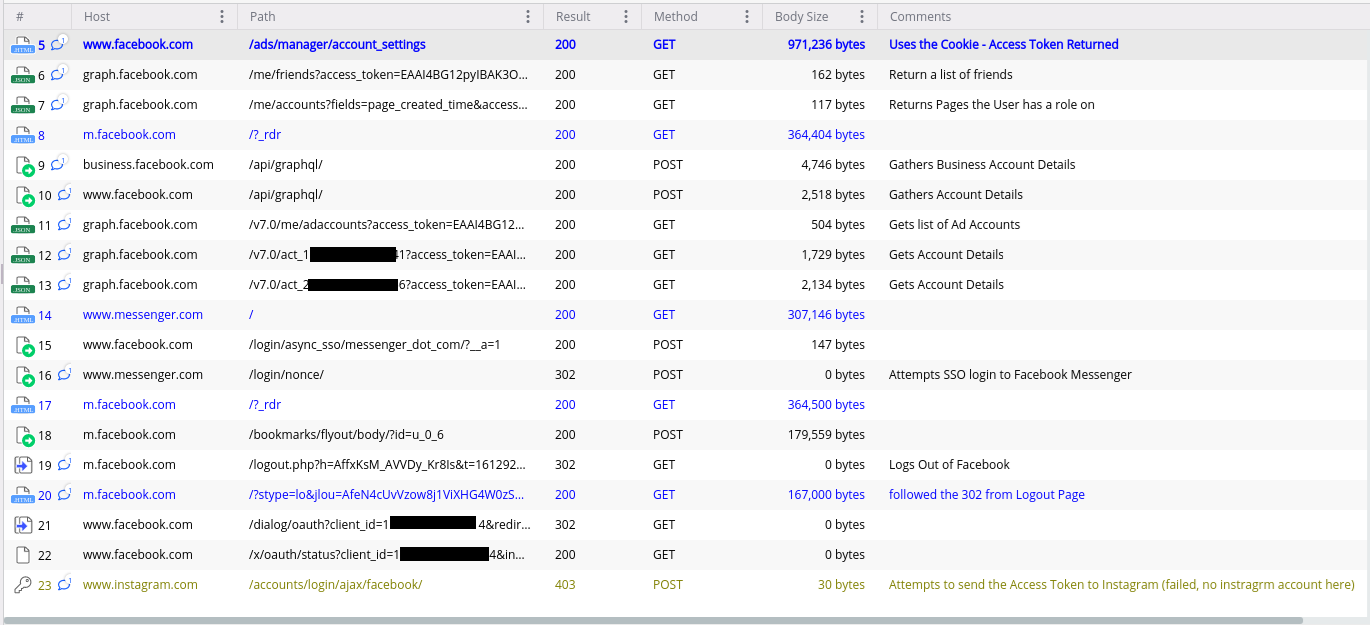 또한 이는 친구 목록, 광고 계정 정보, 접근 가능한 페이스북 페이지 목록 등 추가 콘텍스트를 수집하기 위해 훔친 쿠키를 사용하여 피해자의 페이스북 사용자 액세스 토큰을 가져옵니다.