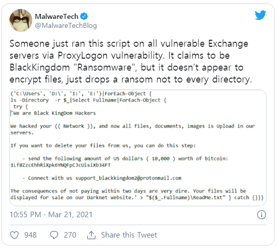 지난 주말, MalwareTech의 Marcus Hutchins는 트위터를 통해 공격자가 랜섬웨어를 배포하기 위해 ProxyLogon 취약점을 악용하여 마이크로소프트 익스체인지 서버를 해킹하고 있다고 밝혔습니다.