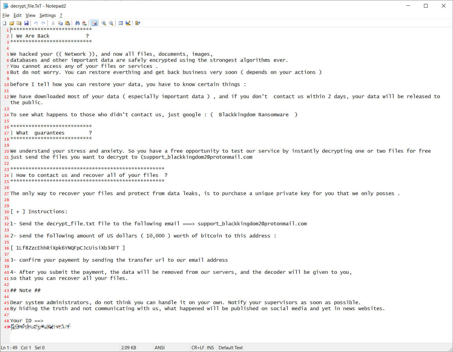 최근 공격과 2020년 여름의 공격이 동일한 랜섬웨어를 사용했는지는 확인되지 않았지만, Hutchins는 현재 랜섬웨어 파일이 윈도우 실행파일로 컴파일된 Python 스크립트라 밝혔습니다. 2020년 6월에 발견된 Black Kingdom 랜섬웨어 또한 Python으로 코딩되었습니다.