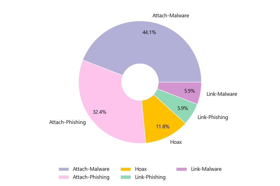 악성 이메일을 유형별로 살펴보면 34건 중 Attach-Malware형이 44.1%로 가장 많았고 뒤이어 Attach-Phishing형이 32.4%를 나타냈습니다.
