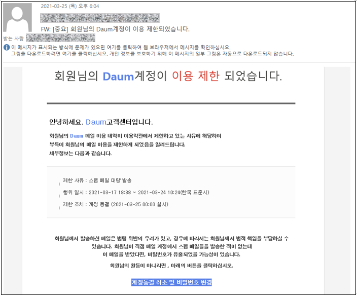 상기 이메일과 첨부파일을 확인할 경우 주의가 필요합니다.