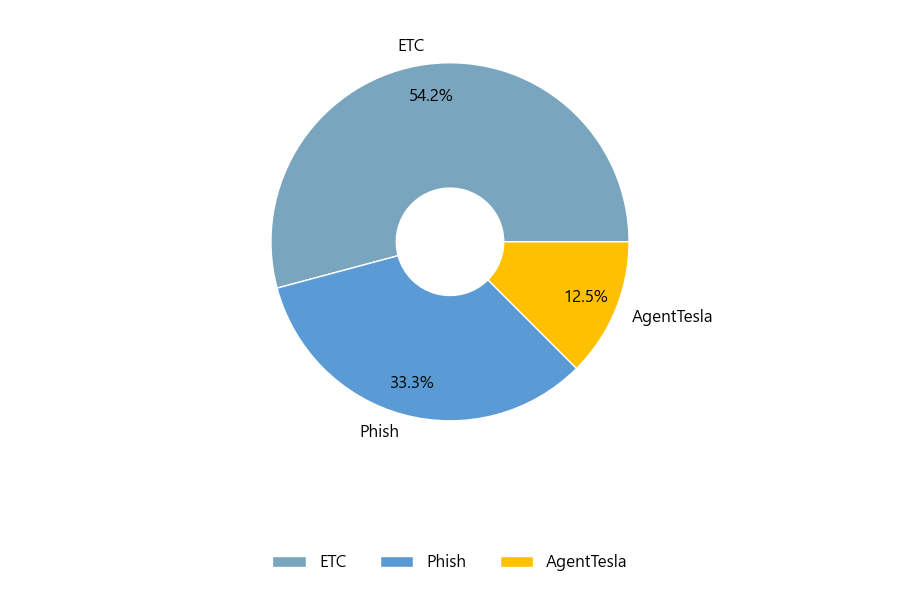 첨부파일은 ‘ETC’형태가 54.2%로 제일 큰 비중을 차지했고 뒤이어 ‘Phish’, ‘AgentTesla’가 각각 33.3%, 12.5%의 비중을 차지했습니다.