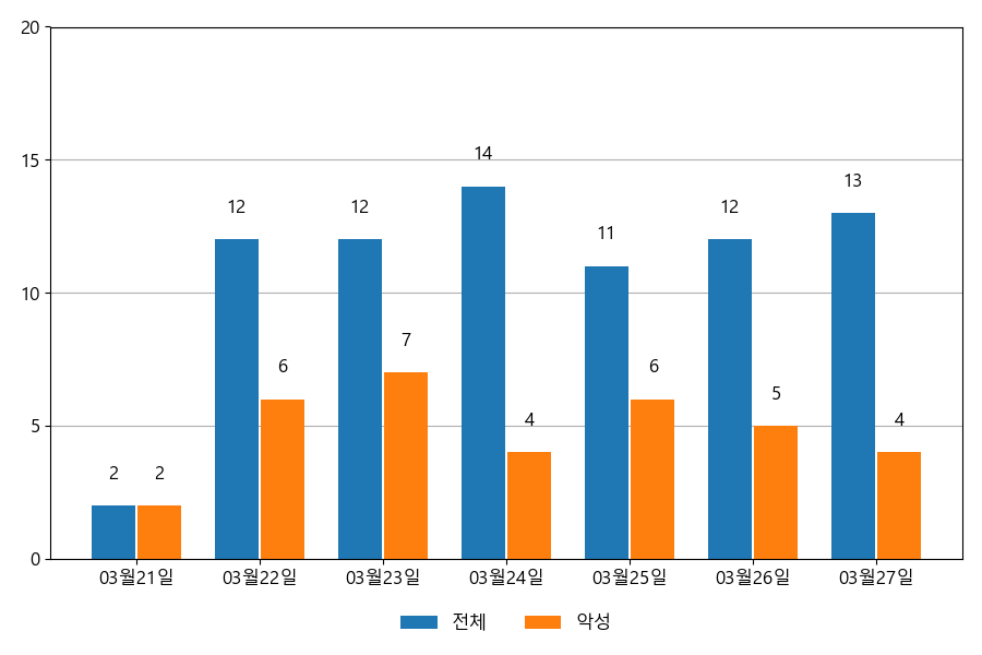 일일 유입량은 하루 최저 2건(악성 2건)에서 최대 14건(악성 7건)으로 일별 편차를 확인할 수 있습니다.