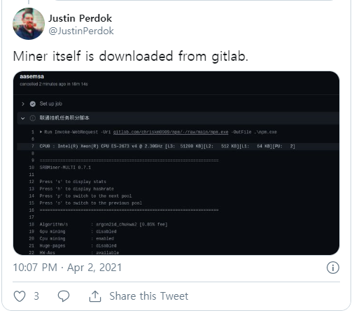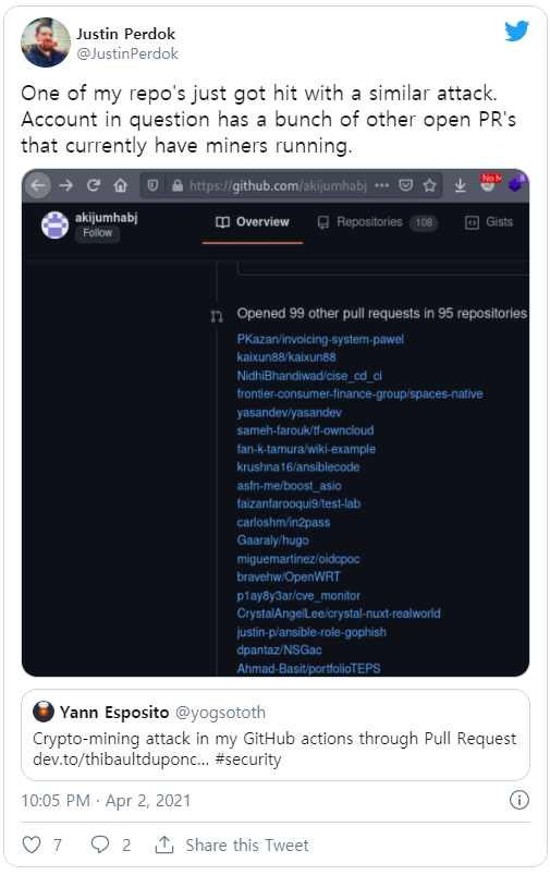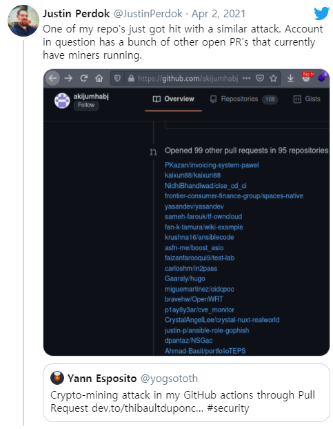 “저는 악성 GitHub 액션을 제작해 액션이 실행될 때 가상화폐 프로그램을 시작하는 GitHub 사용자의 공격을 받았습니다. 공격자의 Pull request로 인해 악성 GitHub 액션이 내 GitHub 액션 내에서 트리거됐습니다."라고 유사한 공격을 받은 피해자가 밝혔다.