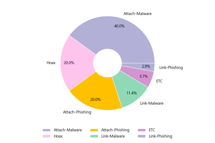악성 이메일을 유형별로 살펴보면 35건 중 Attach-Malware형이 40.0%로 가장 많았고 뒤이어 Hoax형이 20.0%를 나타냈습니다.