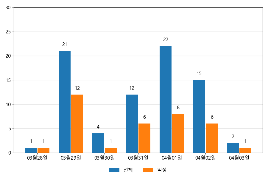 일일 유입량은 하루 최저 1건(악성 1건)에서 최대 22건(악성 12건)으로 일별 편차를 확인할 수 있습니다.