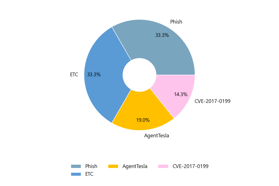 첨부파일은 ‘Phish’형태가 33.3%로 제일 큰 비중을 차지했고 뒤이어 ‘ETC’, ‘AgentTesla’가 각각 33.3%, 19.0%의 비중을 차지했습니다.