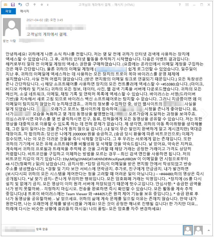 | "고객님의 계좌에서 결제." 제목으로 대량 유포되고 있는 혹스(Hoax) 메일 주의!! (0) | 2021.04.02 |