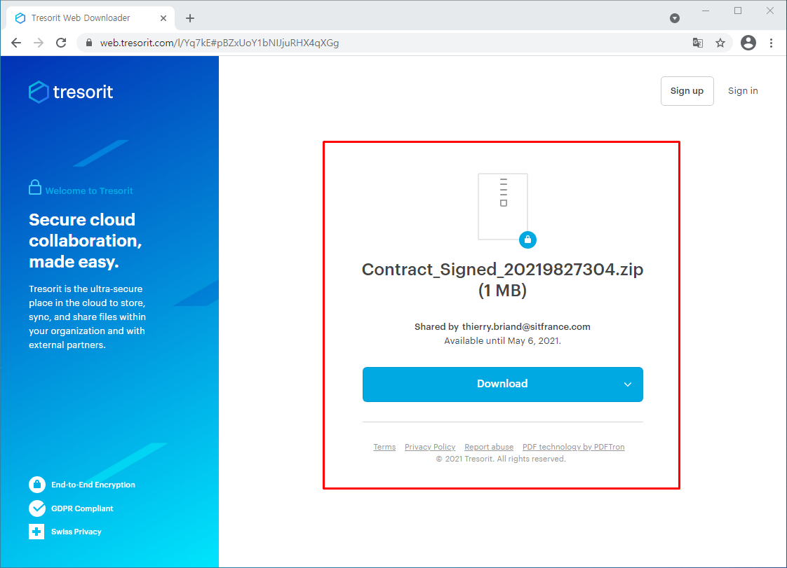 메일 본문에 기재된 링크는 Dropbox가 아닌 Tresorit 서비스 링크로 연결되며, Formbook 악성 파일이 담긴 압축파일을 다운로드할 수 있습니다.