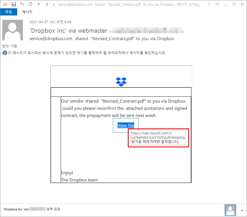 이번에 발견된 악성메일은 "service@dropbox.com shared "Revised_Contract.pdf" to you via Dropbox" 이라는 제목으로 수신되었으며, 본문에 기재된 Dropbox 링크를 통해 허위 견적서 파일을 다운로드하도록 유도합니다.