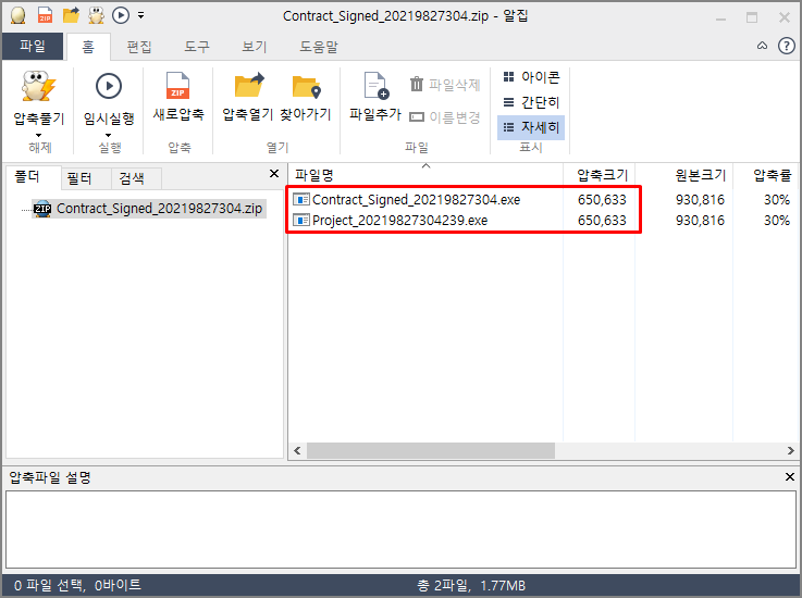 Contract_Signed_20219827304.zip 파일 내부에는 2개의 파일이 포함되며, 파일명만 다른 동일한 해쉬를 가진 파일입니다.