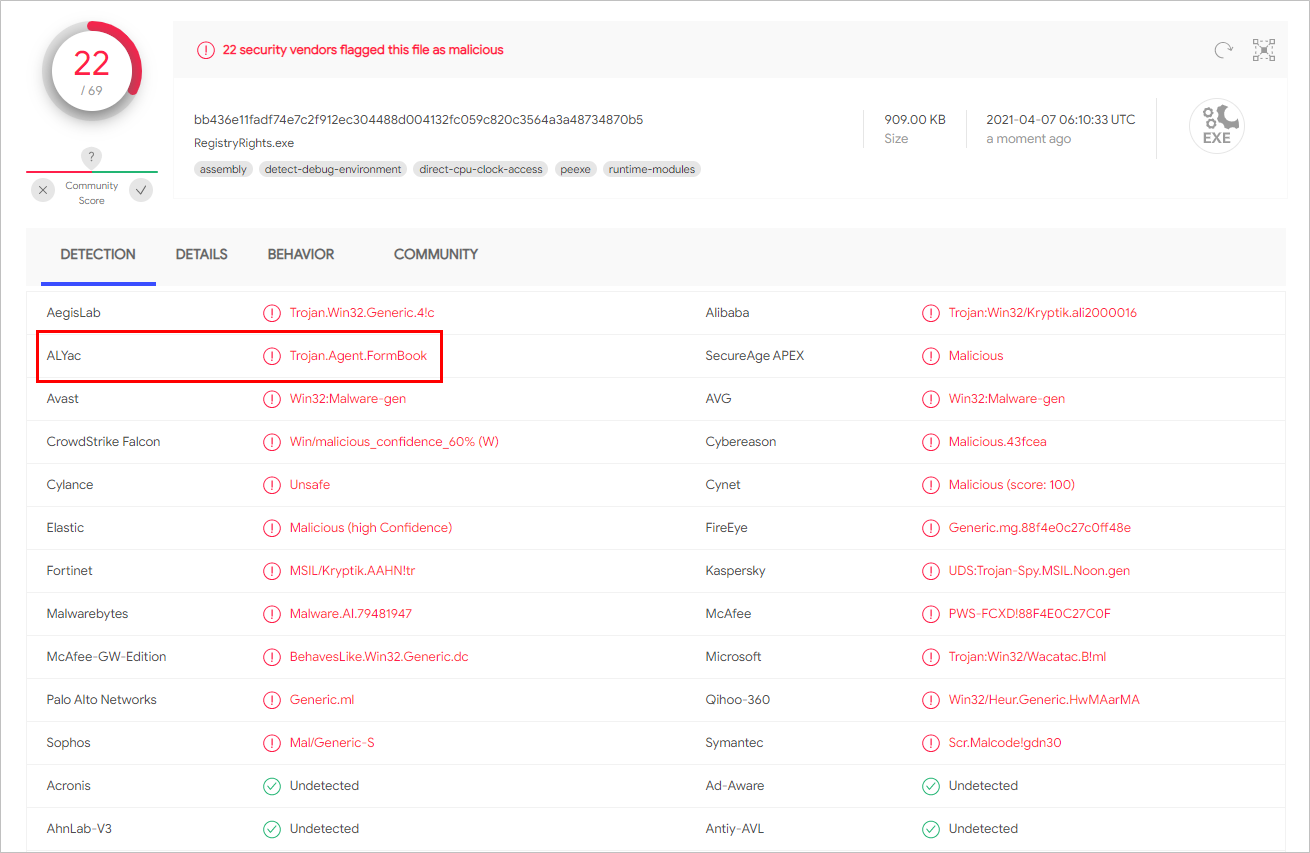 현재 알약에서는 'Trojan.Agent.FormBook' 탐지 명으로 탐지 중입니다.