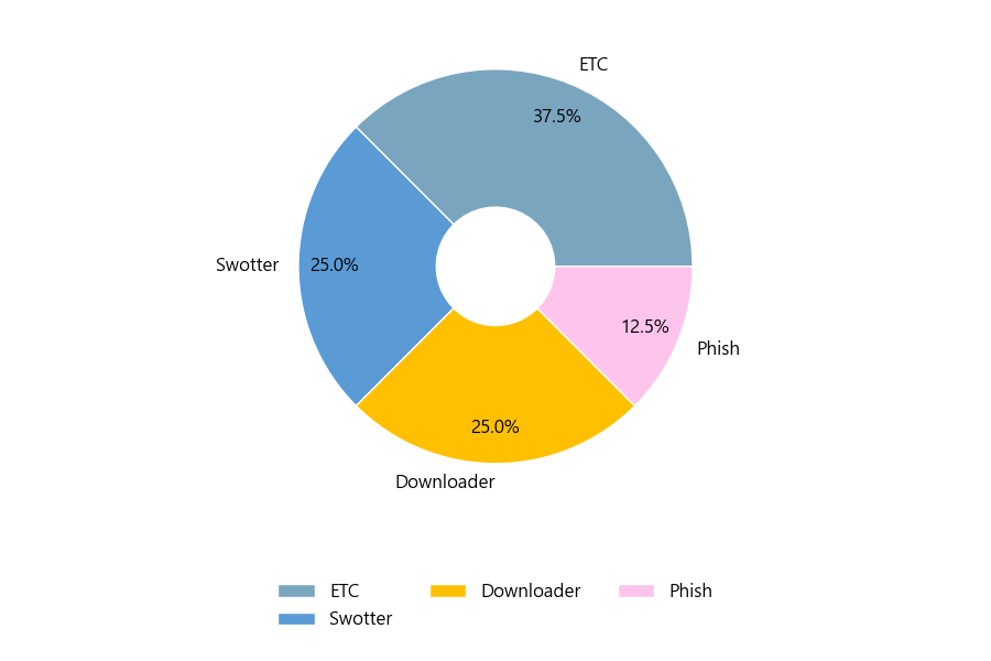 첨부파일은 ‘ETC’형태가 37.5%로 제일 큰 비중을 차지했고 뒤이어 ‘Swotter’, ‘Downloader’가 각각 25.0%, 25.0%의 비중을 차지했습니다.