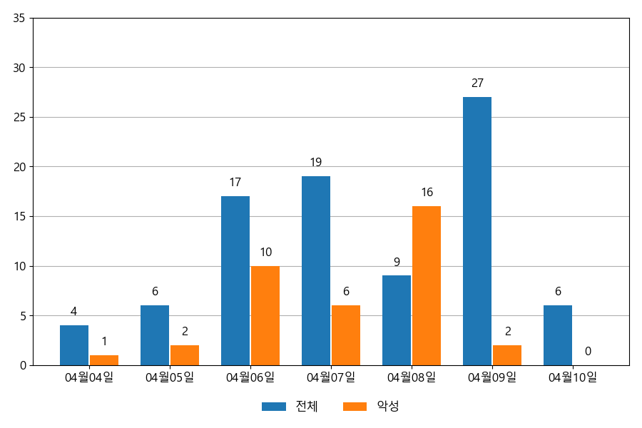 일일 유입량은 하루 최저 4건(악성 1건)에서 최대 27건(악성 16건)으로 일별 편차를 확인할 수 있습니다.