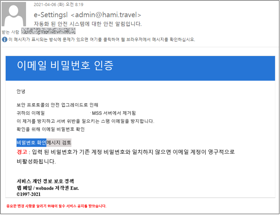 이번주 Pick으로는 몇년간 꾸준히 유포 중인 Phishing 이메일을 선정했습니다. 비빌번호 확인 링크를 클릭하면 이메일과 비밀번호를 기입하는 정형화된 사이트에 접근하게 됩니다. 이와같은 방식은 계속해서 템플릿만 바꿔가며 유포가 되고 있으므로 이메일 확인시 주의가 필요합니다.