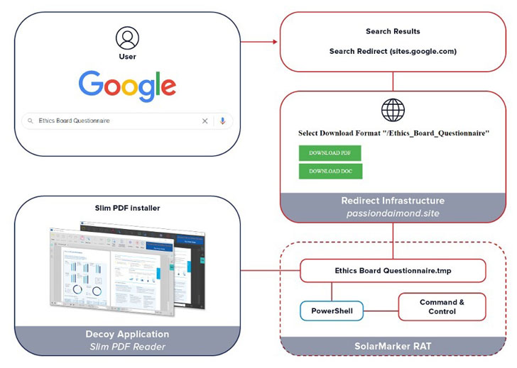 일단 피해자가 공격자가 제어하는 웹사이트에 도착해 검색을 시도한 문서를 다운로드하면, 이는 더욱 정교한 공격을 실행할 수 있는 진입점이 되어 결국 .NET 기반 RAT인 SolarMarker(Yellow Cockatoo, Jupyter, Polazert로도 알려짐)를 설치하게 됩니다.