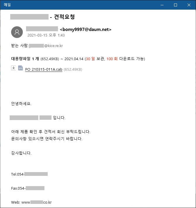 | 트레소리트(Tresorit) 클라우드 서비스를 이용한 Formbook 악성 이메일 주의!! (0) | 2021.04.07 |