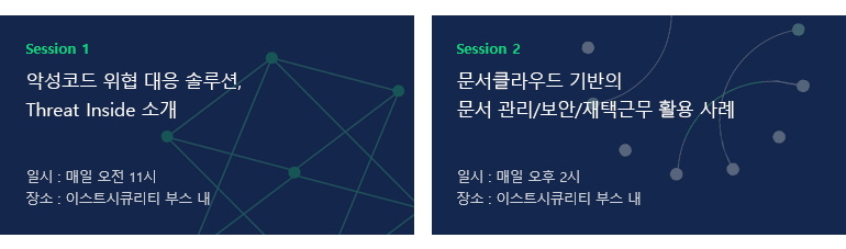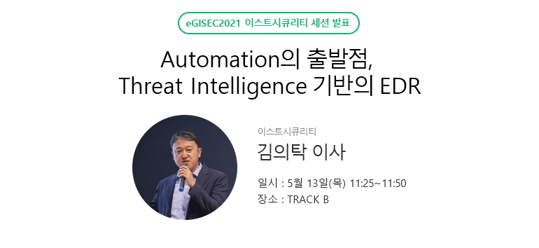또한 이번 eGISEC 2021에서는 이스트시큐리티가 직접 진행하는 여러 세미나도 준비되어 있습니다. 이스트시큐리티 전시 부스(#Q14) 내에서 매일 2회 진행되는 미니 세미나와, 전시회 장내에 따로 마련된 컨퍼런스 룸에서 진행되는 Threat Intelligence 기반의 EDR 솔루션 주제의 세션 발표를 통해 최신 보안 동향과 함께 차세대 엔드포인트 보안 전략과 문서중앙화 솔루션 활용 사례까지 알아보는 의미 있는 세션을 만나보시길 바랍니다.