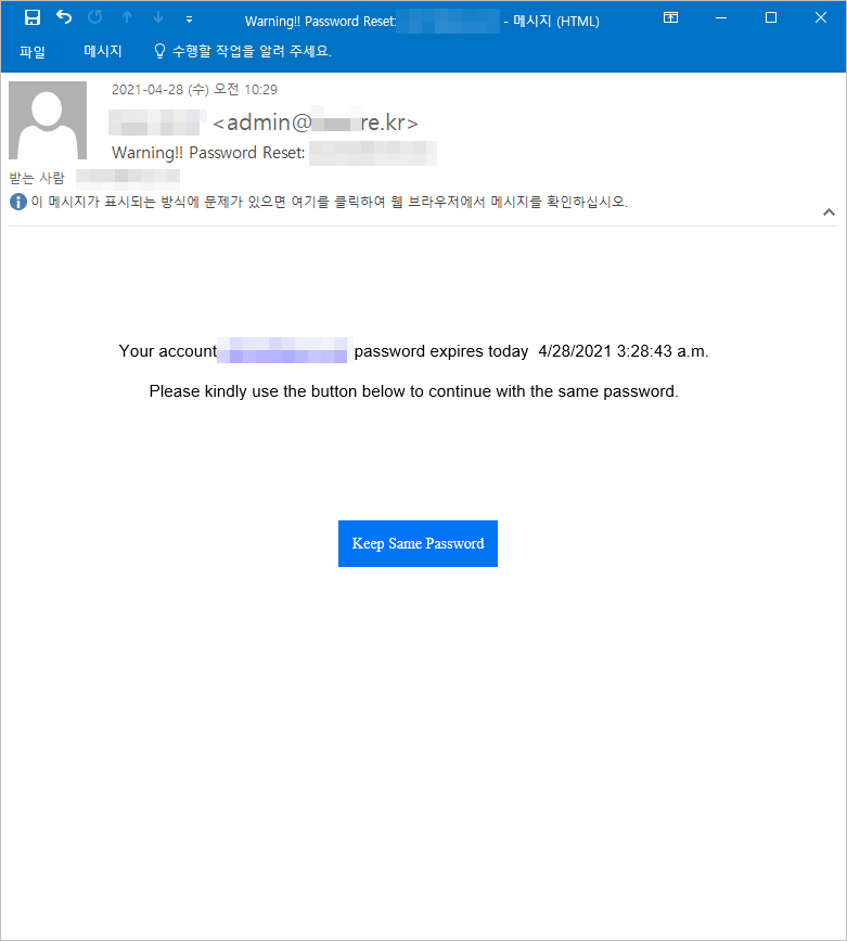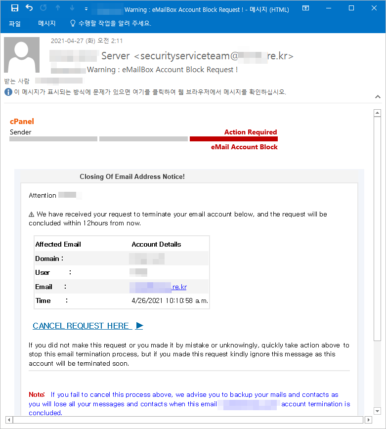 이번에 발견된 메일은 "xxxxx.re.kr Warning : eMailBox Account Block Request !", "Warning!! Password Reset: 아이디@xxxx.re.kr" 라는 제목을 사용하며, 2개의 메일 모두 계정에 문제가 생긴 것처럼 경고성 내용을 가지고 있어 사용자가 본문 내의 링크를 클릭하도록 유도하고 있습니다.