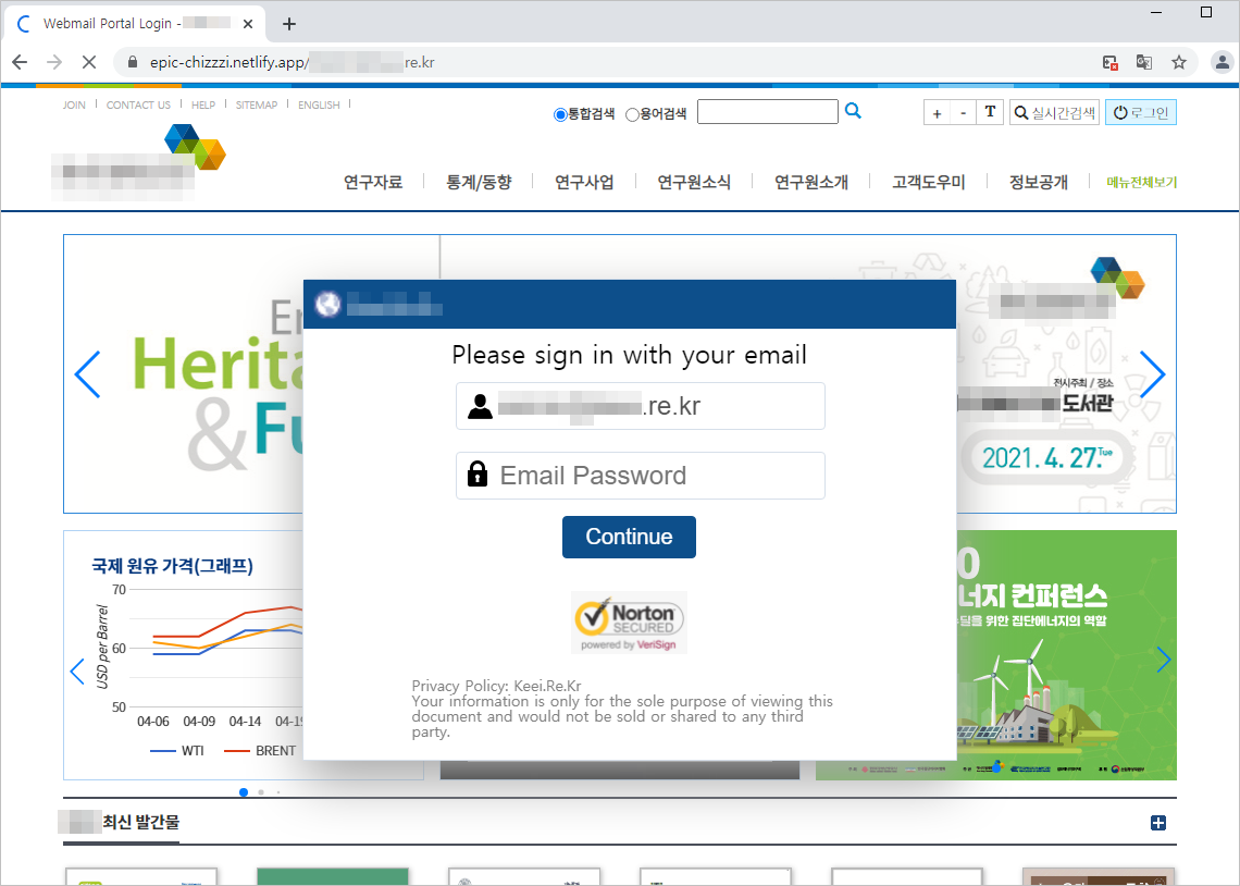 최근 국내 연구기관(re.kr)의 사용자 계정을 타겟으로 한 피싱 공격이 지속적으로 발견되어 사용자들의 주의가 필요합니다.