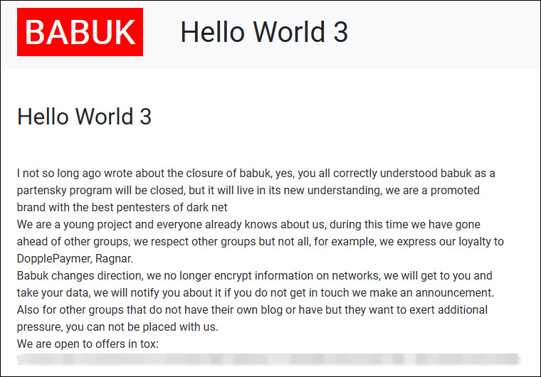 이들의 유출 사이트에 게시된 세 번째 “Hello World” 메시지에 따르면, Babuk에서 새롭게 발표한 모델은 데이터 암호화 컴포넌트를 제외하고는 거의 동일합니다.