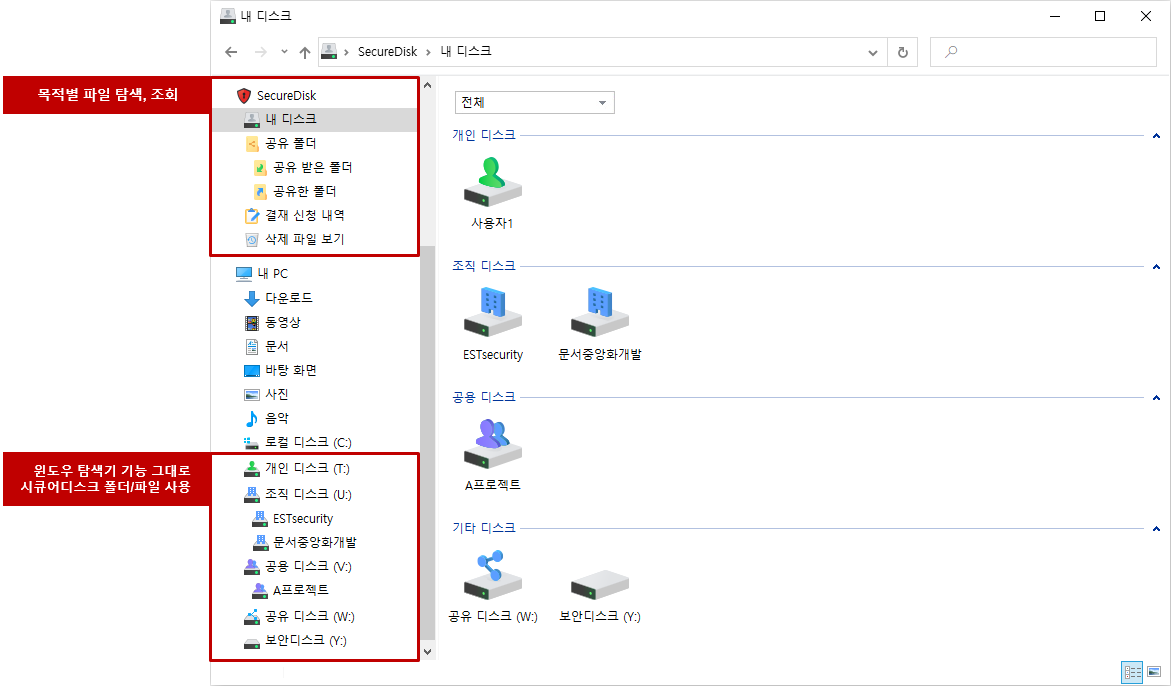 먼저, 이스트시큐리티는 알약 등으로 다져진 필터링, 커널 개발 기술과 서버 개발 노하우를 바탕으로 문서중앙화의 핵심인 로컬 저장 차단 기능과 네트워크 파일 시스템을 구현했습니다. 이에 시큐어디스크 도입 고객들은 도입 전과 동일하게 윈도우 탐색기를 사용할 수 있고, 프로그램의 충돌 없이 안정적으로 로컬 저장 차단 및 서버 파일 활용이 가능해 보안과 편의성을 동시에 확보할 수 있습니다.