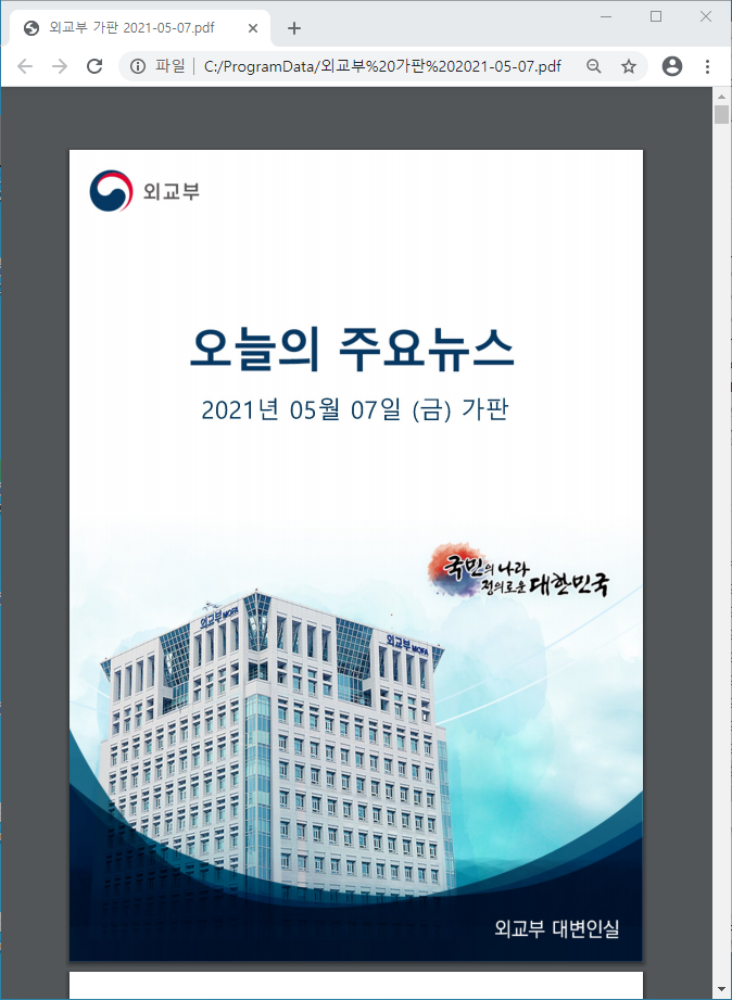 새로 발견된 악성 파일은 2021년 5월 7일 날짜로 발행된 외교부 대변인실 표지의 가판 뉴스가 담긴 정상 PDF 파일 내용을 사용함으로써 수신자의 의심을 최소화했습니다. 악성 파일 안에는 Base64로 인코딩된 데이터와 스크립트가 들어있고, C:\ProgramData\ 경로에 ‘외교부 가판 2021-05-07.pdf’, ‘glK7UwV.pR9a’, ‘efVo8cq.sIhn’ 파일이 설치됩니다. 생성된 ‘glK7UwV.pR9’a파일은 C:\ProgramData\Software\ESTsoft\Common\ 경로에 마치 이스트소프트 업데이트 파일처럼 위장한 64비트 악성 DLL 파일을 추가하고 호출합니다.