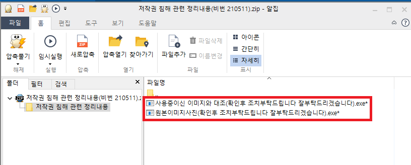 메일에 첨부된 압축파일 내부에는 저작권 관련 내용으로 보이는 두 개의 파일이 포함되어 있지만 이미지 또는 문서 파일이 아닌 실행파일(EXE)로 구성되어 있는 것이 확인됩니다.