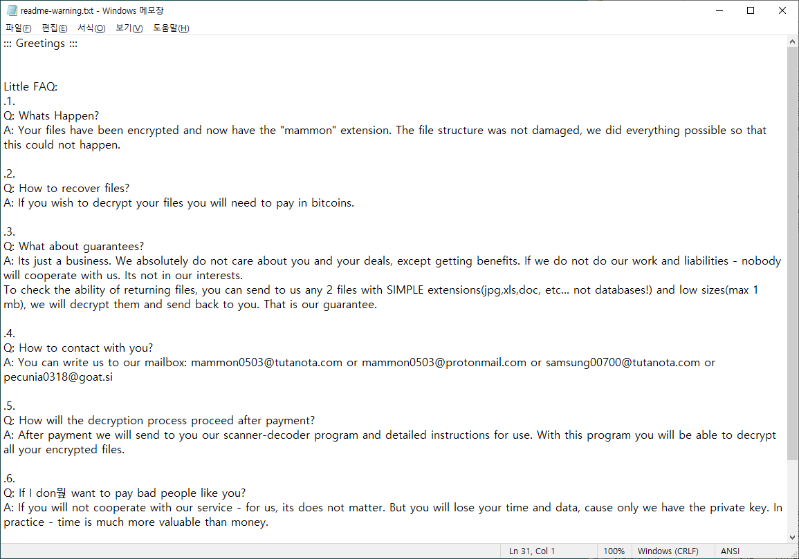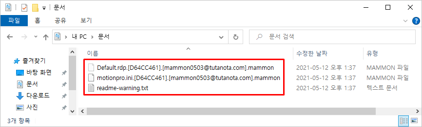 Makop 랜섬웨어는 파일 암호화 기능을 수행하는 악성코드로, 'readme-warning.txt' 제목의 랜섬노트 팝업창을 통해 사용자 기기의 파일이 암호화되었으며, 암호화된 파일의 확장자가 .[CD59D479][mammon0503@tutanota.com].mammon 형태로 변경되었음을 알립니다. 또한 사용자가 파일 복구를 원한다면 아래 메일 주소로 연락을 취할 것을 요구합니다.