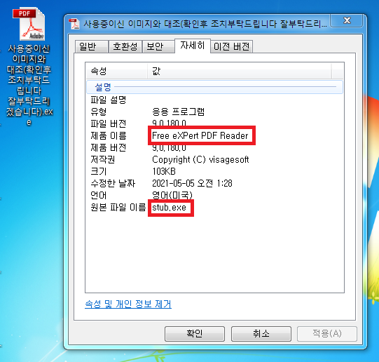 파일들의 상세 정보를 살펴보면 두 파일 모두 제품 이름은 Free eXPert PDF Reader로, 원본 파일 이름은 'stub.exe'로 되어있으며, 클릭할 경우 Makop 랜섬웨어가 실행됩니다.