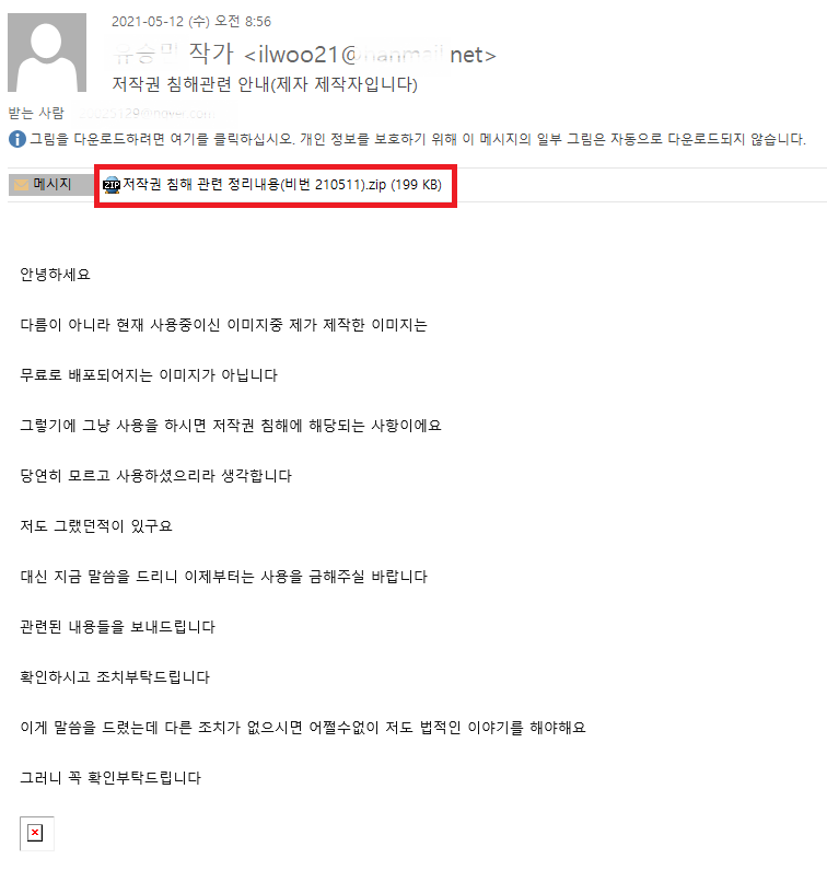 해당 메일에는 '저작권 침해 관련 정리내용(비번 210511).zip' 제목의 압축 파일이 첨부되어 있고, 파일을 확인하여 조치를 하지 않을 경우 법적 절차를 진행하겠다는 식으로 협박하며 사용자 클릭을 유도합니다.