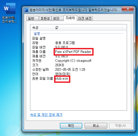파일들의 상세 정보를 살펴보면 두 파일 모두 제품 이름은 Free eXPert PDF Reader로, 원본 파일 이름은 'stub.exe'로 되어있으며, 클릭할 경우 Makop 랜섬웨어가 실행됩니다.