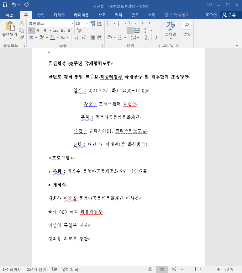 제헌절 국제학술포럼은 7월 27일 진행 일정의 포럼 내용을 담고 있으며, 개회식 내용에 통일부와 외교부장관 이름이 포함돼 있고, ‘한반도 평화·통일 교두보-북중러접경 국제공항 및 배후단지 조성방안’이라는 내용이 담겨 있습니다.
