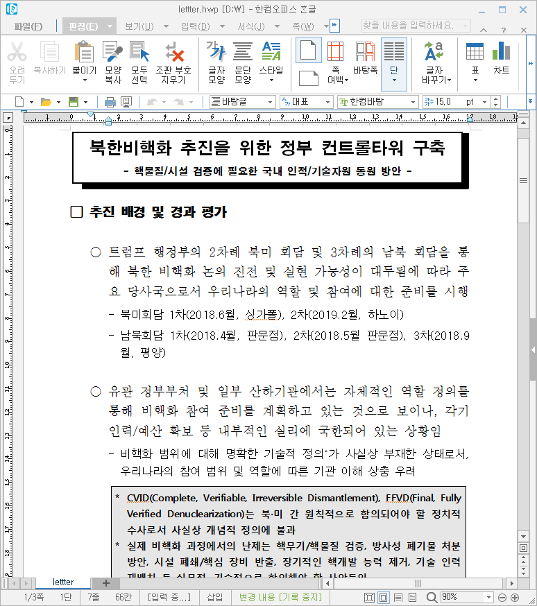이러한 유형은 신뢰할만한 문서 내용처럼 수신자를 현혹하는 전형적인 스피어피싱 공격으로, ‘북한비핵화컨트롤타워구축(안)’이라는 제목의 문서는 ‘핵물질·시설 검증에 필요한 국내 인적·기술자원 동원 방안’이라는 제목으로, 관련 산하기관으로 산업자원부, 과기정통부, 국방부, 원자력안전위원회 등의 내용이 포함돼 있습니다.