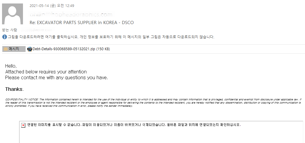 금일(5월 14일) 오전 12시 49분 경, 'Re: EXCAVATOR PARTS SUPPLIER in KOREA - DSCO'라는 제목의 피싱 메일이 추가로 발견되었습니다. 발신 주소 역시 실제 존재하는 웹 디자인 기업이며, 수신자 도메인 또한 위 3개의 메일과 동일하게 국내 유명 포털사이트 계정을 사용했습니다.