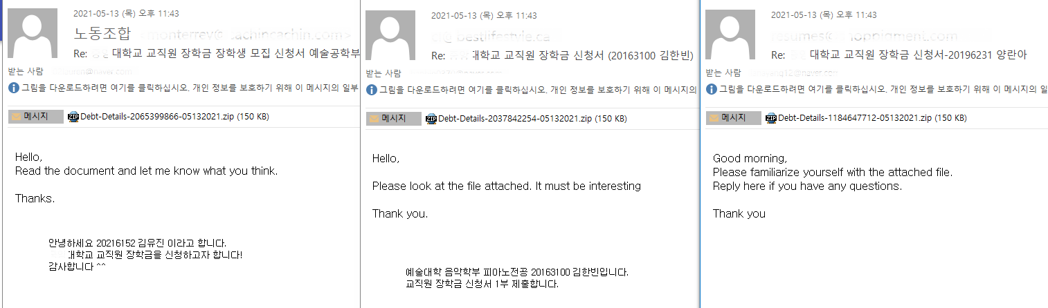 5월 13일 오후 11시 43분 경에 수신된 것으로 확인되는 메일들은 'Re: 00대학교 교직원 장학금 장학생 모집 신청서 예술공학부', 'Re: 00대학교 교직원 장학금 신청서 (20163100 김한빈)', 'Re: 00대학교 교직원 장학금 신청서-20196231 양란아'와 같은 제목을 사용하며, 본문에는 학생의 이름, 전공과 학번 등을 포함해 장학금을 신청한다는 내용을 담고 있습니다. 본문은 영어와 한글 버전이 모두 작성되어 있어, 수신자의 국적에 관계 없이 첨부파일을 열어보도록 유도했습니다. 메일에 사용된 발신 주소 도메인은 실제로 존재하는 스페인, 캐나다 등의 해외 기업으로 신뢰성을 높였습니다. 수신자 도메인은 모두 국내 유명 포털사이트 계정을 사용했습니다.