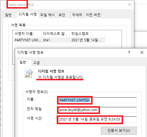 lertio.cersw 속성을 살펴보면, 유효한 디지털 서명이 사용된 것을 볼 수 있습니다. 'PARTYNET LIMITED'라는 이름과 'anne.doylel@yahoo.com' 도메인을 사용했고, 서명 시간은 2021년 5월 14일 금요일 오전 9시 24분 경으로 나타납니다. 또한 Process 생성, Mutex 생성, Process 인젝션, Directory 생성, File 생성/복사/이름 변경, File, Directory 속성 변경, Registry 생성, Registry 값 설정, Network 접속 등의 동작을 실행합니다.