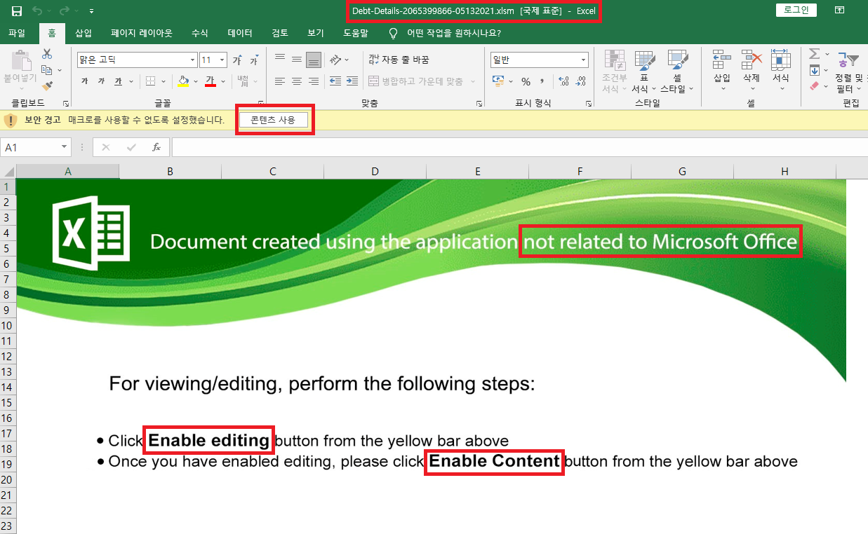 해당 파일 실행시, 문서 상단에는 '매크로를 사용할 수 없도록 설정했습니다.'라는 문구를 포함한 보안 경고창이 나타나며, 문서 열람 및 편집을 위해 사용자에게 '편집 사용' 버튼 및 '콘텐츠 사용' 버튼을 클릭하도록 유도합니다.