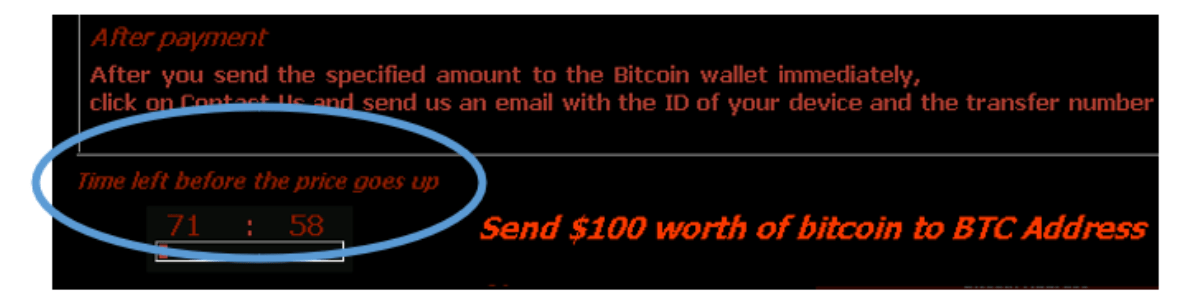 Judge 랜섬웨어의 랜섬노트 화면은 아래와 같습니다. 카운트다운 윗부분에 표시된 텍스트는 “가격이 인상되기까지 남은 시간”으로 표시되어 있습니다. 하지만 NoCry 랜섬웨어에서는 “파일이 손실되기까지 남은 시간”으로 표시되어 위협을 더욱 심각하게 표현했습니다.